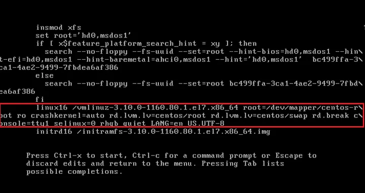 3. Use as teclas de seta para mover o cursor para a linha que começa com “linux16” e adicione “ rd.break console=tty1 selinux=0 ” antes de rhgb quiet.